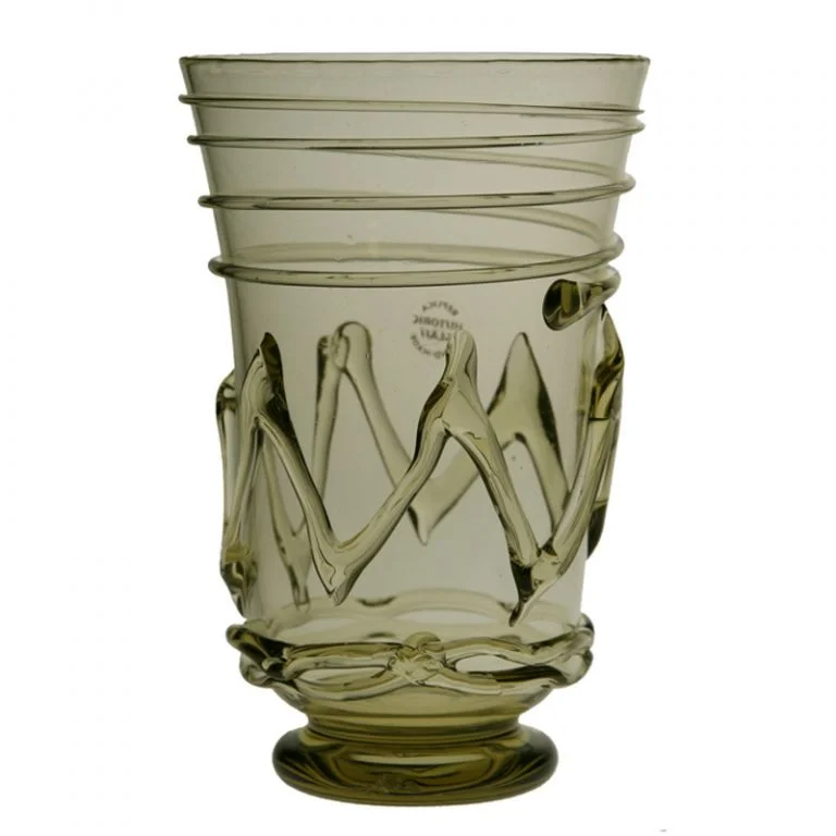 Grön bägare med tråddekor tillverkad efter modell från Kvietorp på Gotland i Sverige, 400-talet. Glaset har en volym på ca. 50 cl.