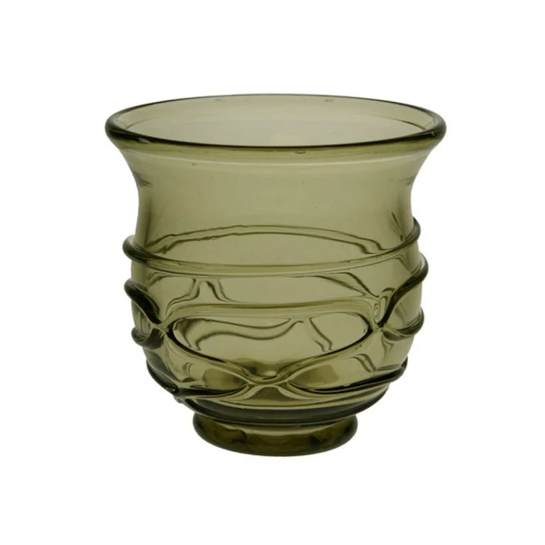 Grön bägare med glastrådsdekor tillverkad efter modell från Södra Kvinneby på Öland i Sverige, 300-talet. Glaset har en volym på ca 40 cl.