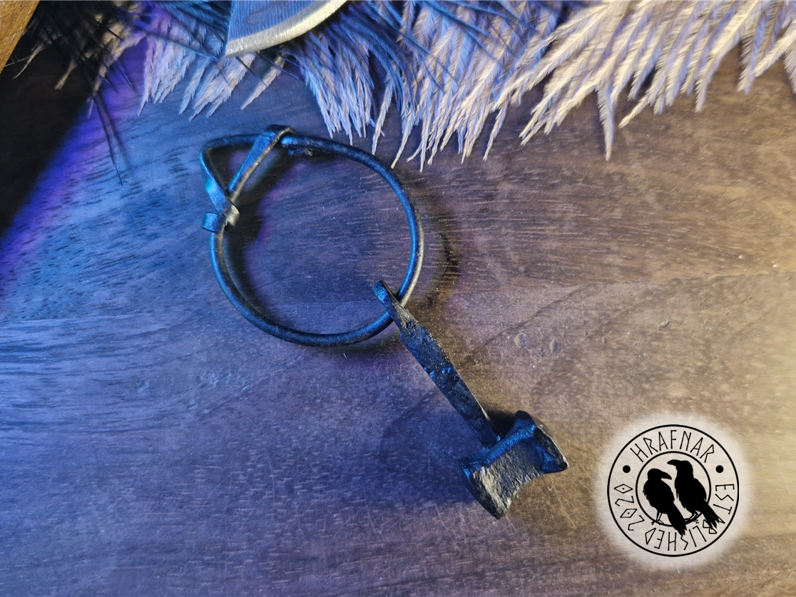 Massiv torshammare med ring av järn/smide. Höjd på ungefär 8 cm.